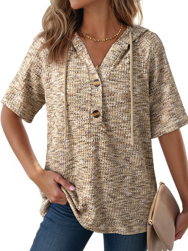 With a clean silhouette and easy wearability, the Waffle V Neck Hooded Short Sleeve Top fits seamlessly into your rotation.