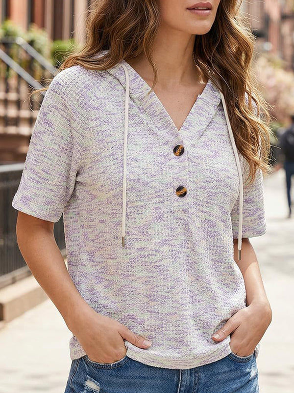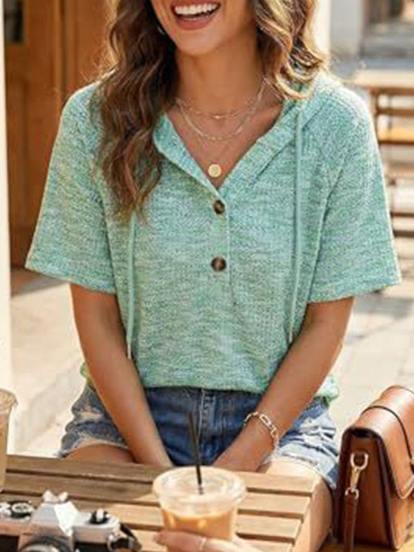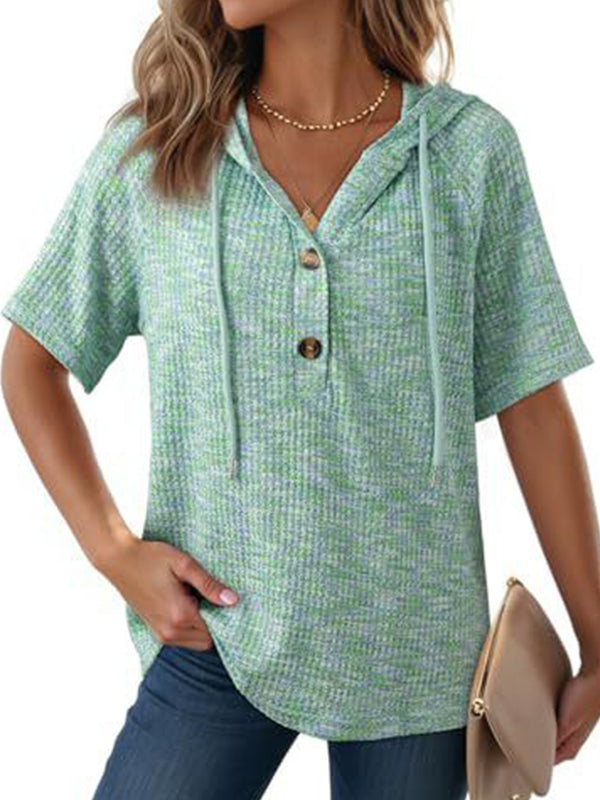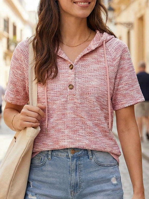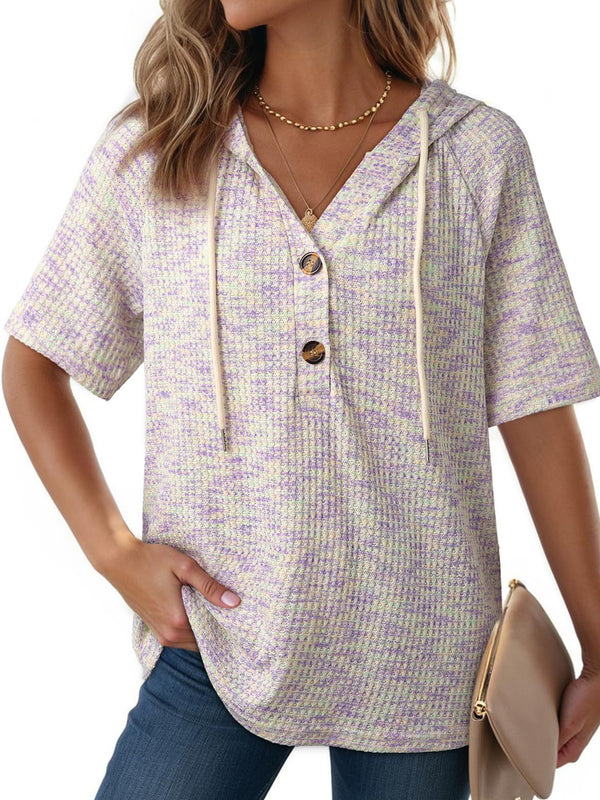 Waffle V Neck Hooded Short Sleeve Top
