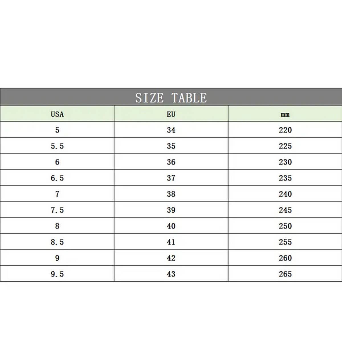 Size: 5, 5.5, 6, 6.5, 7, 7.5, 8, 8.5, 9